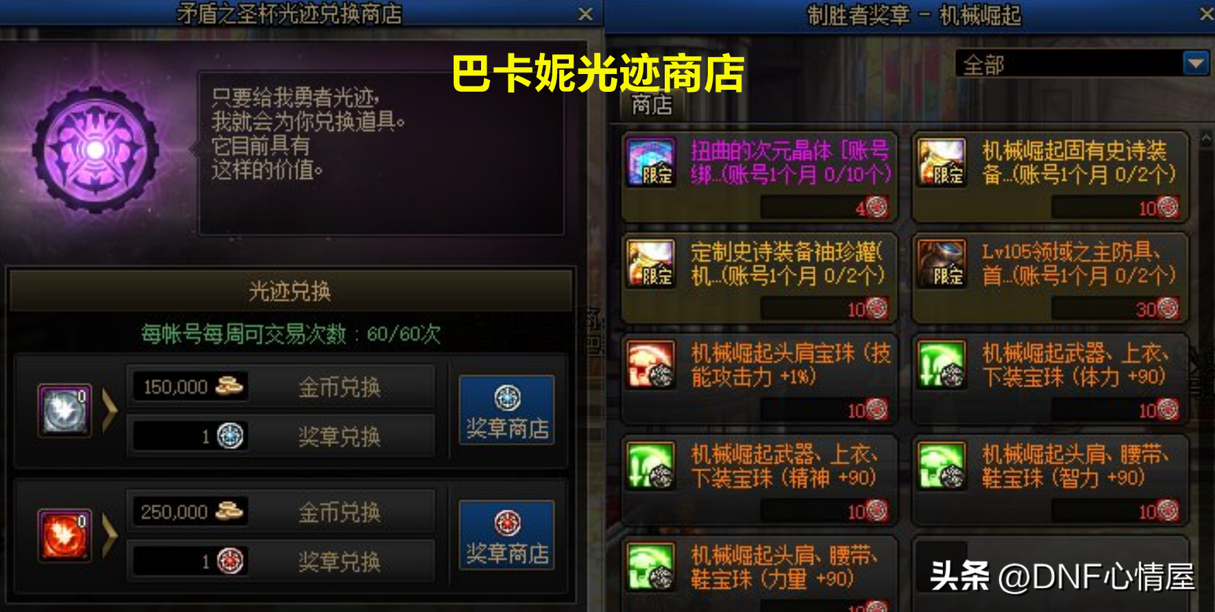 巴卡妮也有光迹商店,涵盖了诸多道具兑换,分别是扭曲次元晶体(洗自定义道具)、巴卡妮固有装备罐子、自定义史诗罐子、传说罐子、次顶级宝珠等等。