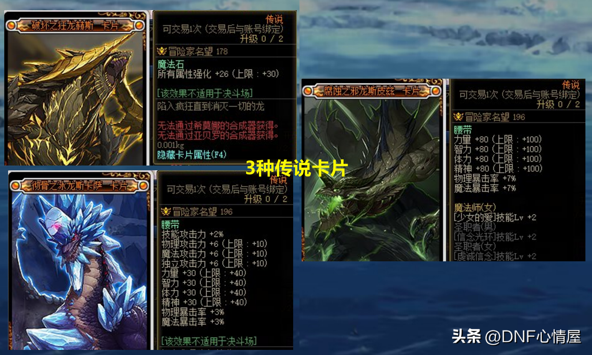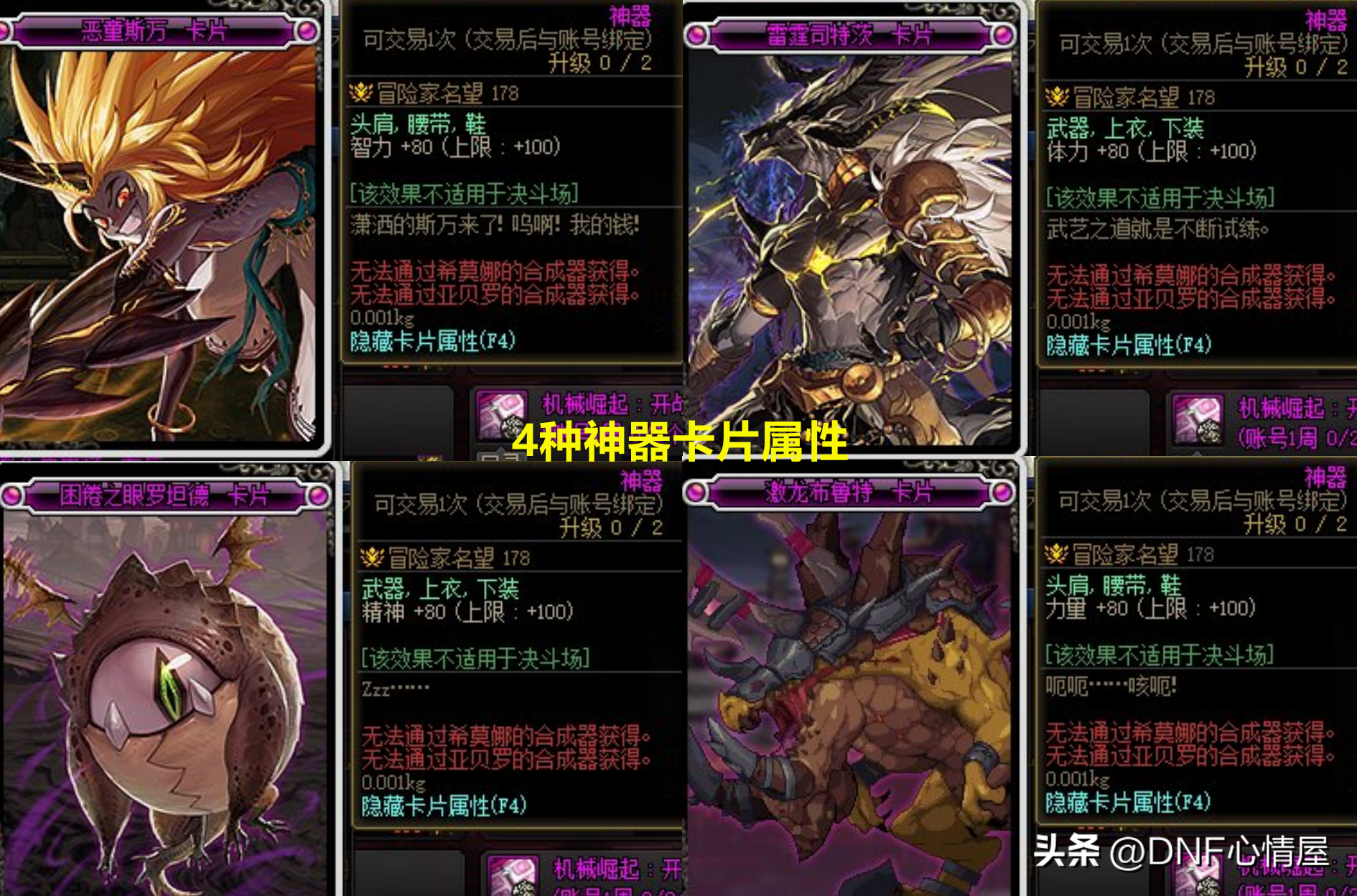 而4个神器品质的卡片,分别是头肩腰带鞋智力/力量+100、武器上衣下装体力/精神+100,对于辅助职业挺有用的,但输出没啥大用,除非小号无特色宝珠,可以凑合过度。