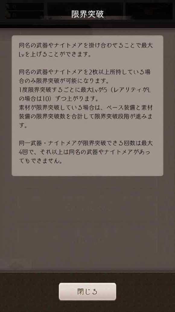 拥有两件及以上同名武器或者nightmare(另一种提升角色的物品,尚不知晓,下记为nm)时,可以进行界限突破。