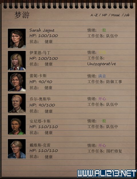 幸存者列表——显示了所有幸存者的情况,他们当前是否在进行某项工作。