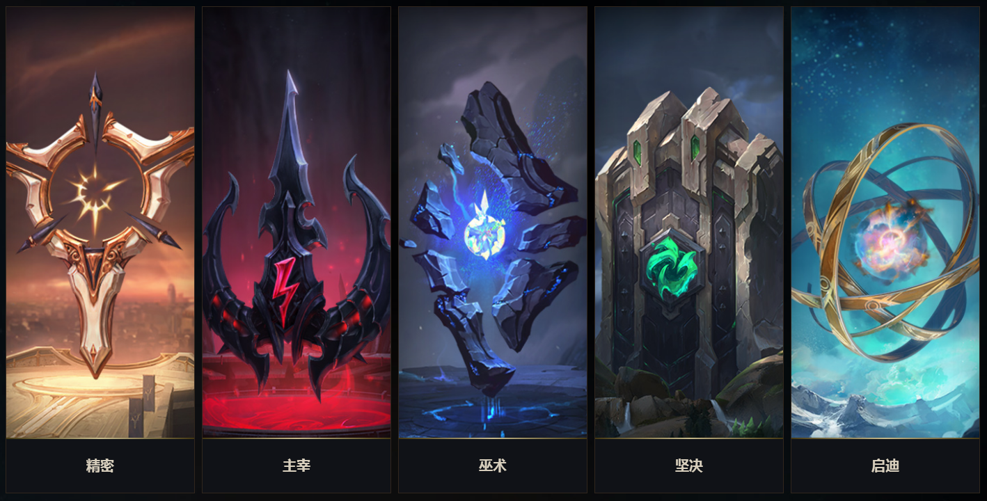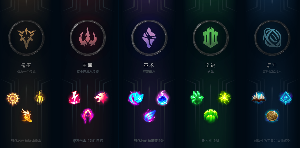 精密(强化持续输出适合AD射手)、主宰(强化爆发伤害适合刺客)、巫术(强化技能适合AP)、坚决(强化控制和肉度适合坦克)、启迪(创造性天赋适合辅助)。