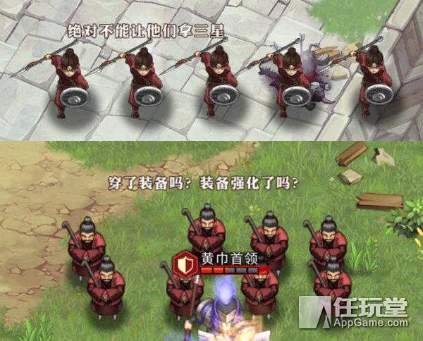 除了这些显而易见的特点,游戏在一些细节上的设计其实也非常地用心和与众不同,比如推副本的时候一些拦路小兵会很“温馨”地提示你:装备强化了没?角色突破了没?商城可以买烧鸡和葡萄酒等;有的也会很霸气地说:不能让他们拿三星、不能让他们拿星级宝箱、突破了再来吧。这些小提示其实很多游戏会设计在加载界面中,本作却把它们设计在这里倒是挺有意思的。