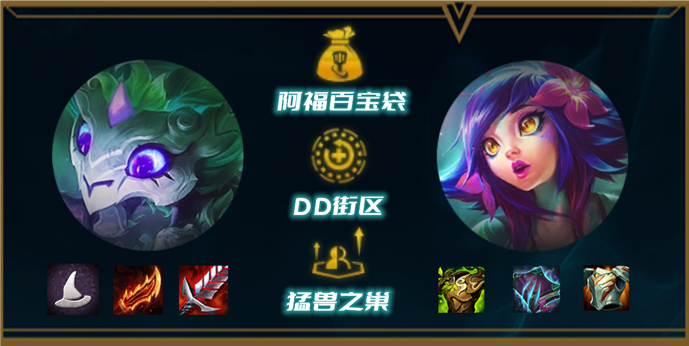 海克斯方面有阿福百宝袋必拿,这样就可以直接和蓝水滴合成法转,这是这个玩法的核心。然后就是DD街区,纳尔是低费卡,所以在6至7人口时要D到3星,DD街区的收益很大。最后就是猛兽之巢可以给换形师和身边队友加攻速非常好用。