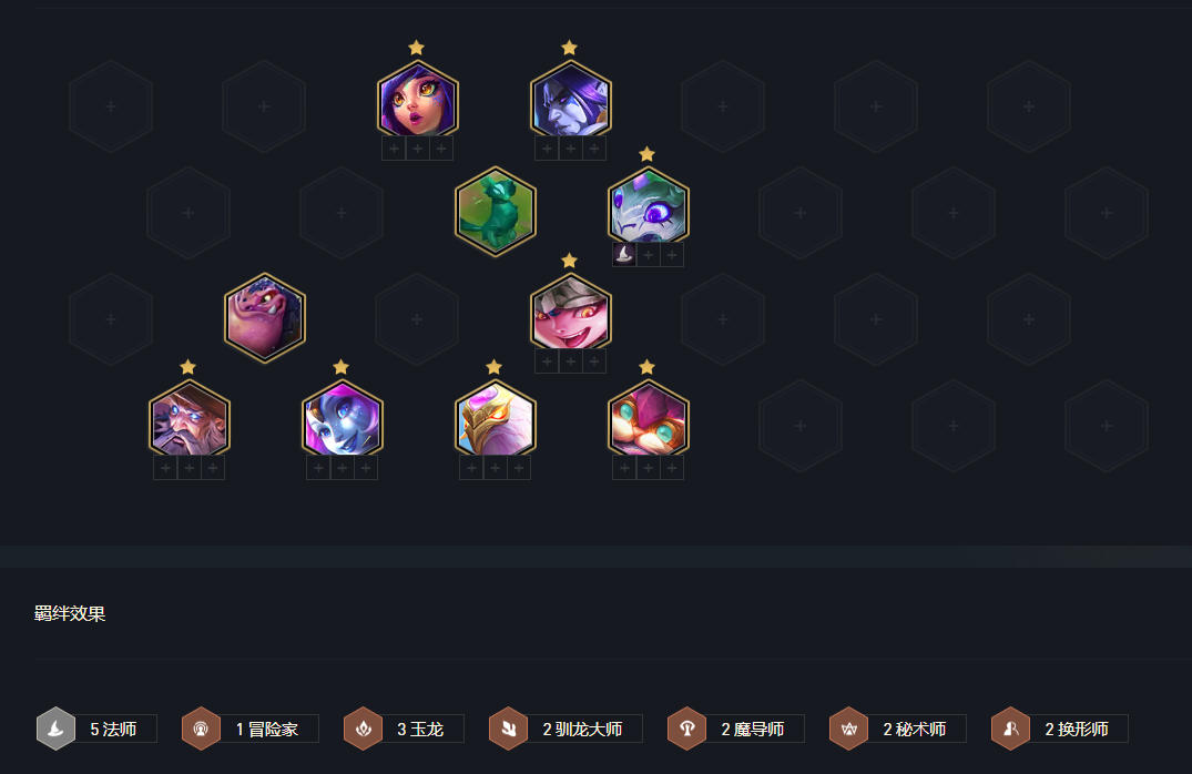 这个阵容成型后以5法3玉龙2换形师为核心,外加2驯龙,2秘书,2魔导师,其中5法师很关键,因为没有5法师纳尔的属性会被3法师修正。玉龙和换形师保证了纳尔的生存能力,5法师带来的高额的攻击护甲让纳尔能打能抗。