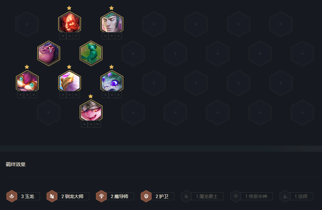 这个阵容运营比较简单,在第一轮选秀或者第一个海克斯拿到铲子或者法转后就可以确定玩这个阵容,直接使用纳尔作为主C,前期凑出3玉龙2驯龙2魔导2护卫就有不错的战斗力,纳尔装备优先做好,神装后纳尔就可以打连胜。