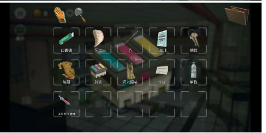 4、来到二楼储藏室,拿上制服,药筒,洞穴服装和桌上的卡片,回到案发现场搬上尸体,用万能卡打开左边门进入。