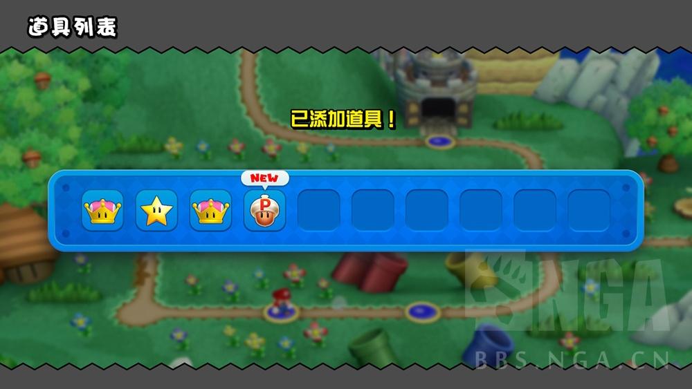与DS和3DS版本的《超级马力欧兄弟》有些不同 关卡里的道具并不能即时储存 也不能即时使用 想储存道具只能通过补给小屋获得 而新增的皇冠则是奇诺比珂的专属道具