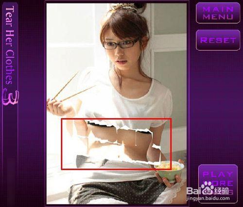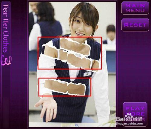 游戏中是没有时间限制的,如果感觉撕衣服的程度和角度不满意,或者想重新选择其他美女的,还可以点击右边的【MAIN MENU】按钮返回主页重新选择美女开始游戏。点击【RESET】按钮可以恢复本关的原始状态。