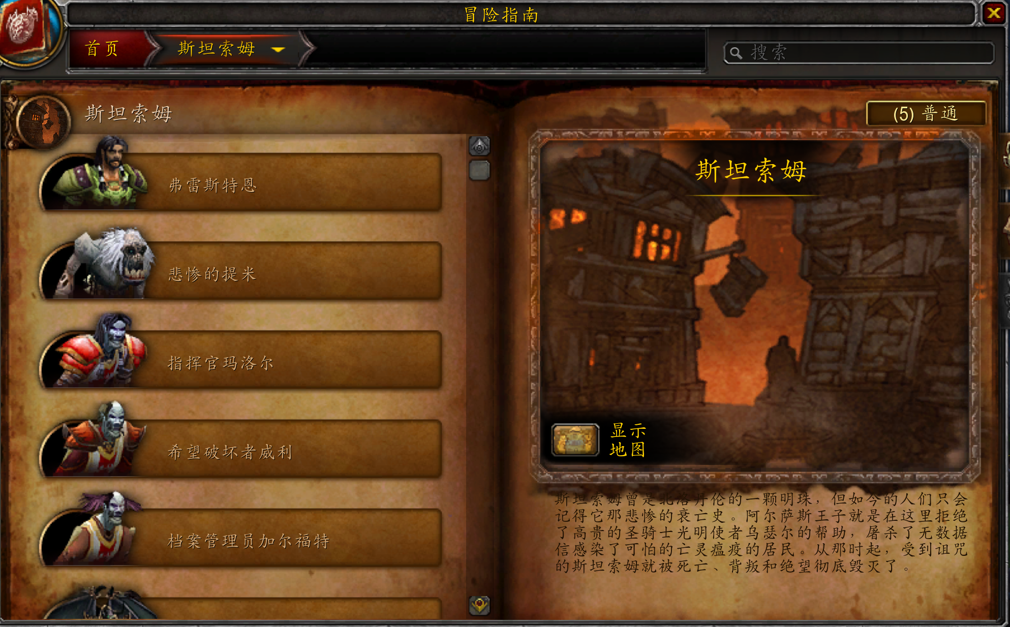 斯坦索姆是曾是北洛丹伦的一颗明珠,也是人口第二大的城市,同时还是白银之手骑士团的创立地。第三次大战期间,阿尔萨斯王子就是在这里拒绝了高贵的圣骑士乌瑟尔·光明使者的帮助,疯狂的毁灭了斯坦索姆,屠杀了无数据信感染了可怕的亡灵瘟疫的居民。从那时起,受到诅咒的斯坦索姆就被死亡、背叛和绝望彻底毁灭了,亡灵在那不久后就占据了城市。如今,斯坦索姆成为了洛丹伦天灾军团的首都,烈焰一直燃烧到今天都不曾熄灭。斯坦索姆,但如今的人们只会记得它那悲惨的衰亡史。