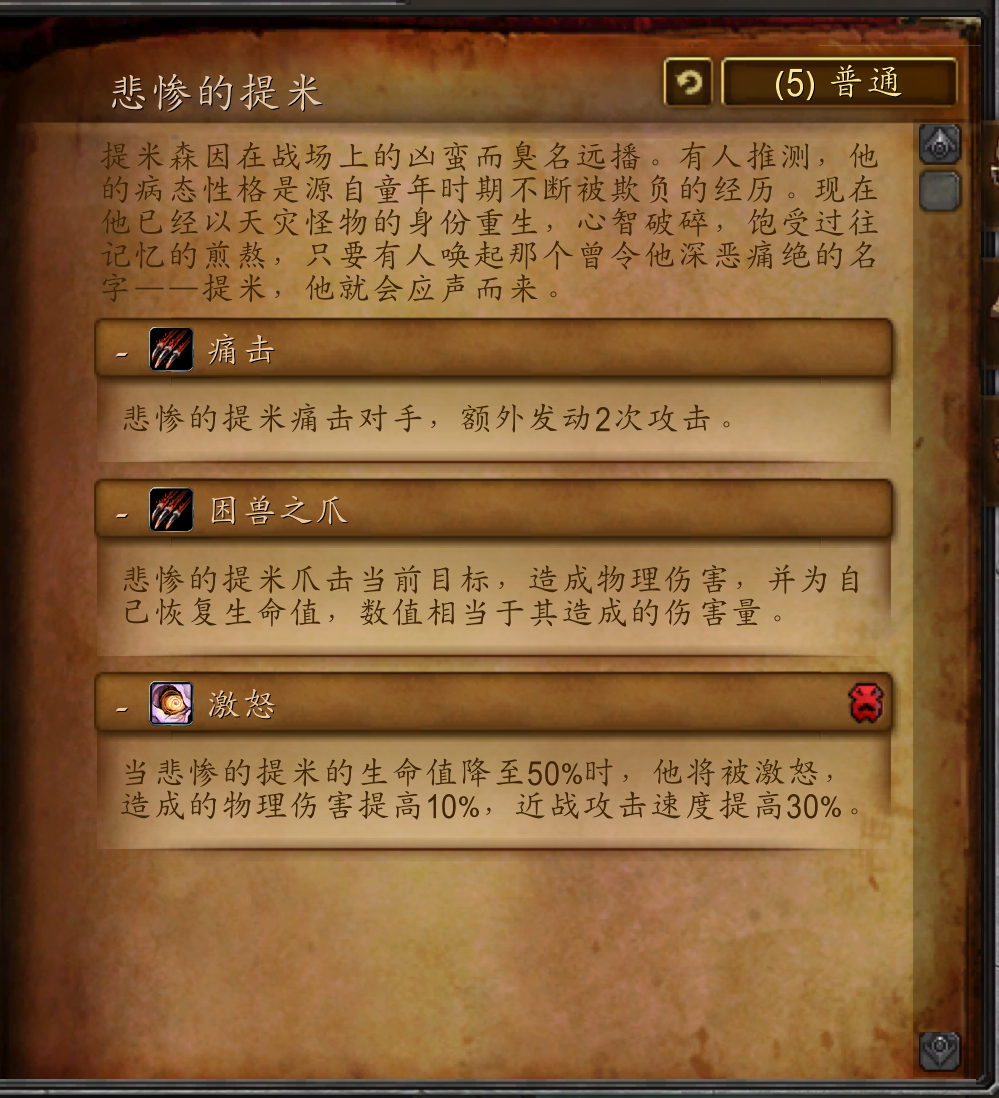 提米森因在战场上的凶蛮而臭名远播。有人推测,他的病态性格是源自童年时期不断被欺负的经历。现在他已经以天灾怪物的身份重生,心智破碎,饱受过往记忆的煎熬,只要有人唤起那个曾令他深恶痛绝的名字——提米,他就会应声而来。