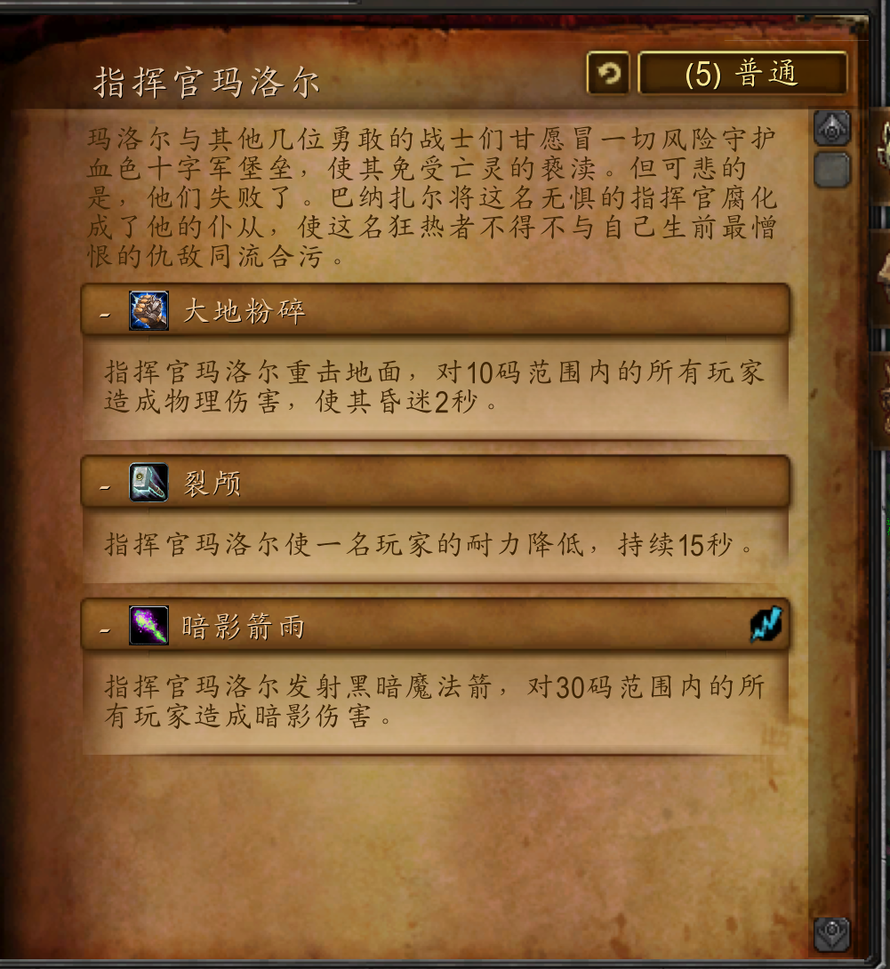 玛洛尔与其他几位勇敢的战士们甘愿冒一切风险守护血色十字军堡垒,使其免受亡灵的亵渎。但可悲的是,他们失败了。巴纳扎尔将这名无惧的指挥官腐化成了他的仆从,使这名狂热者不得不与自己生前最憎恨的仇敌同流合污。