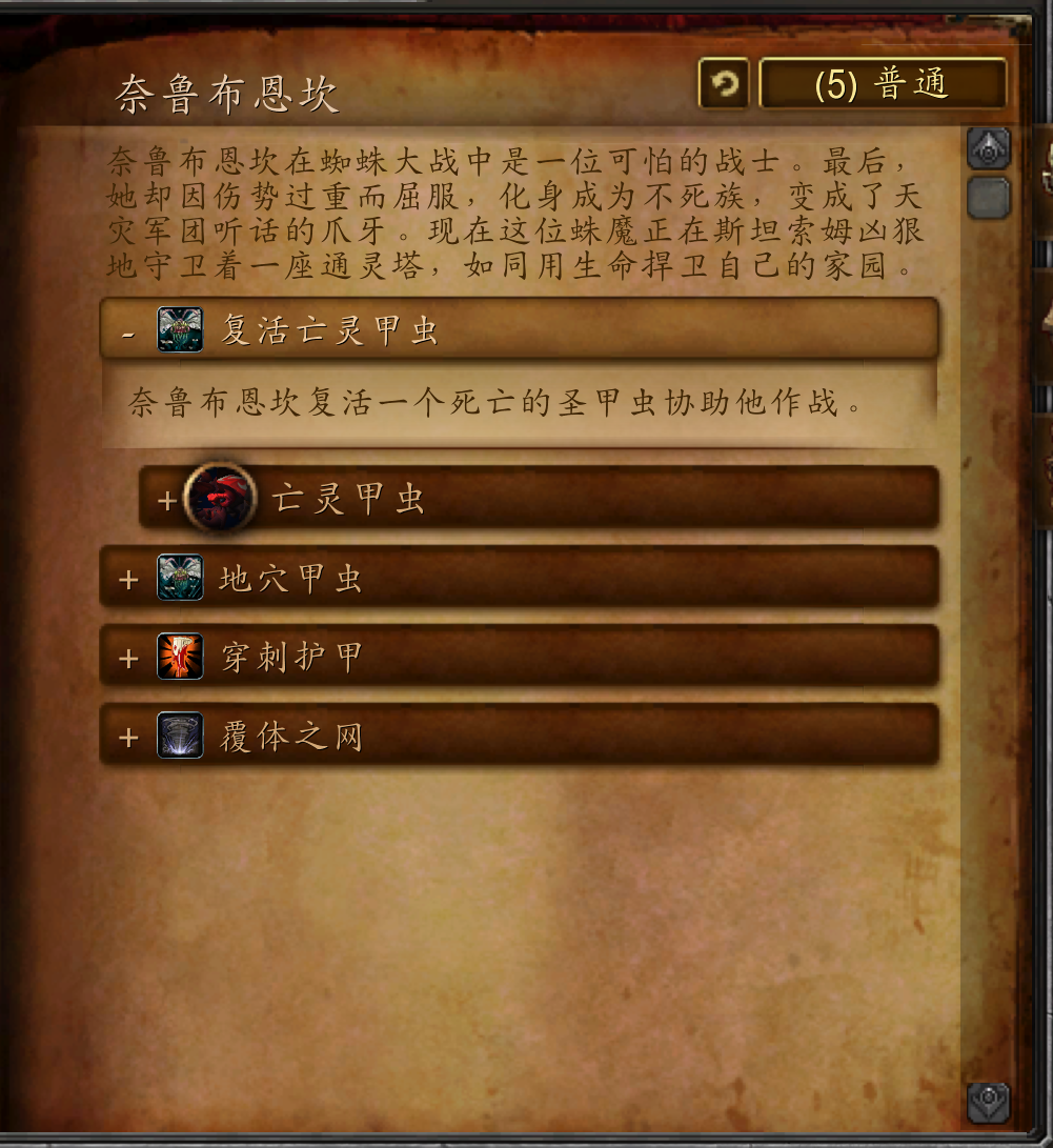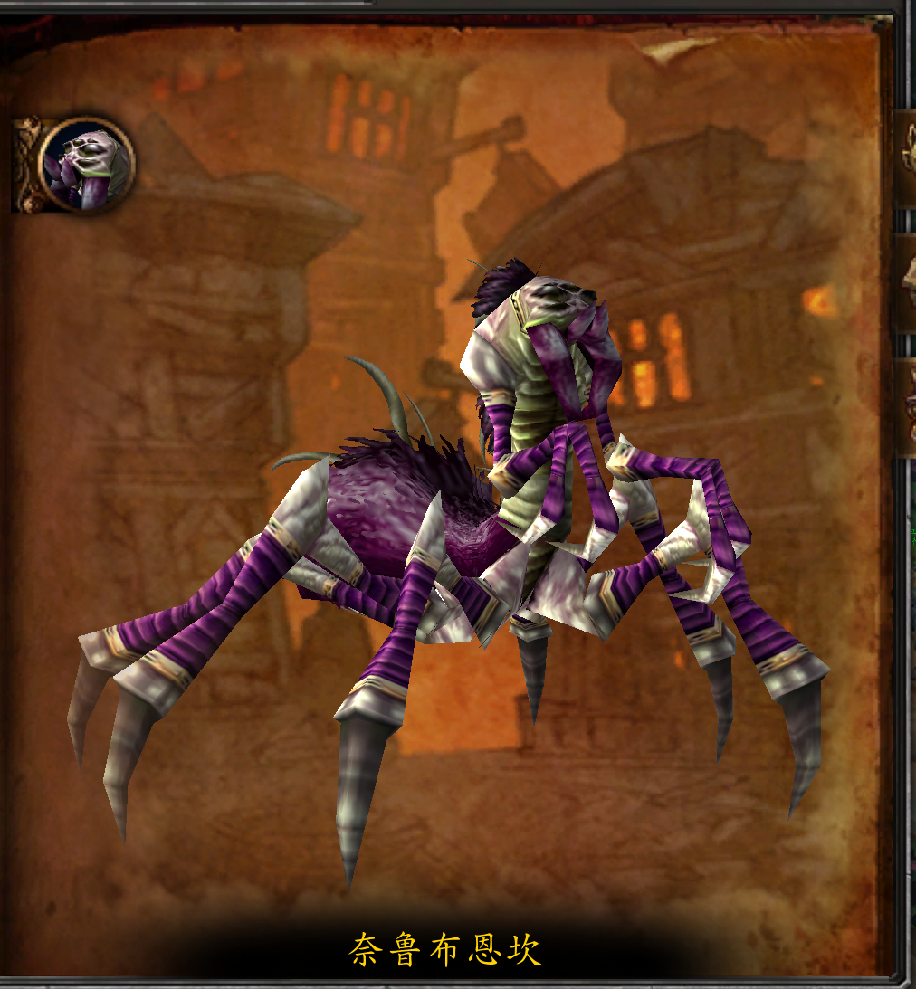 奈鲁布恩坎在蜘蛛大战中是一位可怕的战士。最后,她却因伤势过重而屈服,化身成为不死族,变成了天灾军团听话的爪牙。现在这位蛛魔正在斯坦索姆凶狠地守卫着一座通灵塔,如同用生命捍卫自己的家园。