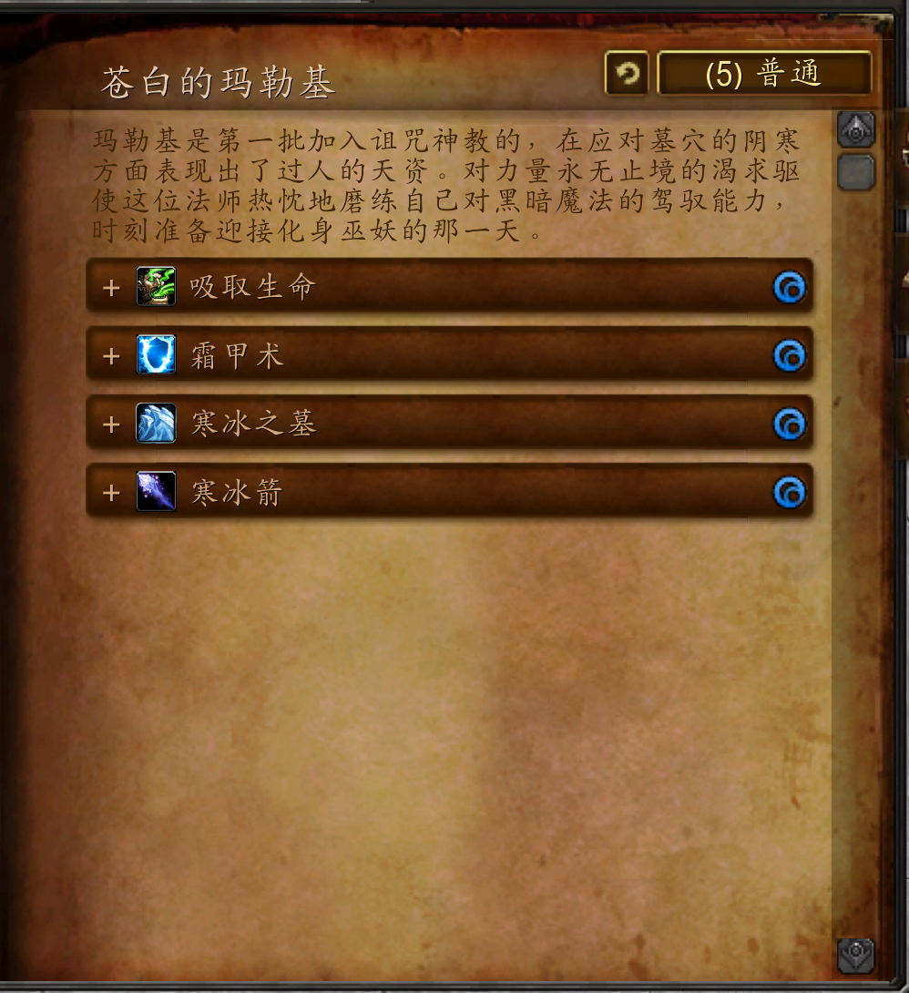 玛勒基是第一批加入诅咒神教的,在应对墓穴的阴寒方面表现出了过人的天资。对力量永无止境的渴求驱使这位法师热忱地磨练自己对黑暗魔法的驾驭能力,时刻准备迎接化身巫妖的那一天。