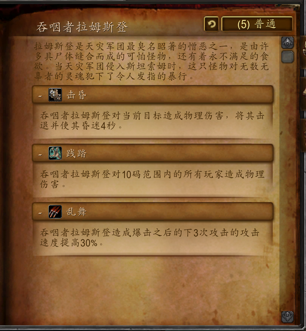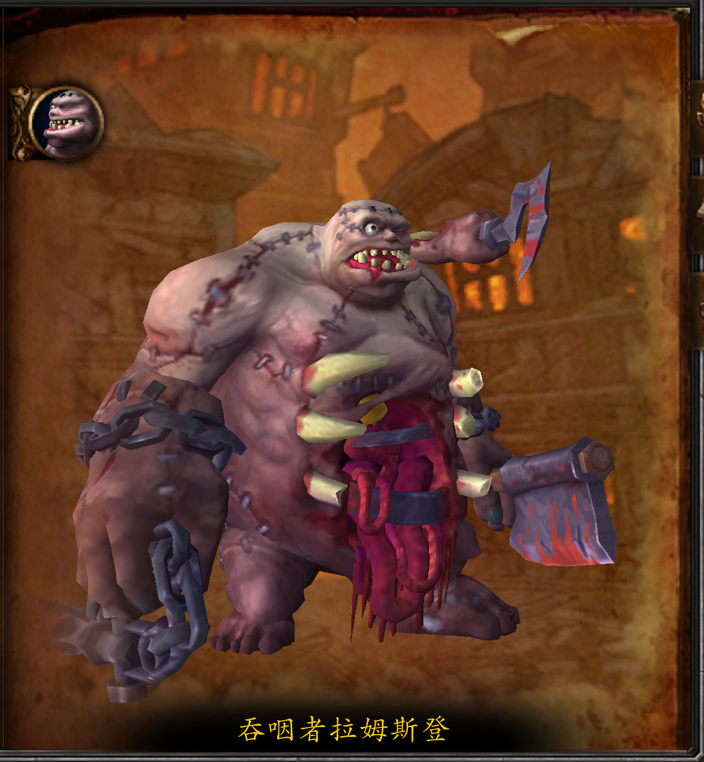 拉姆斯登是天灾军团最臭名昭著的憎恶之一,是由许多具尸体缝合而成的可怕怪物,还有着永不满足的食欲。当天灾军团侵入斯坦索姆时,这只怪物对无数无辜者的灵魂犯下了令人发指的暴行。