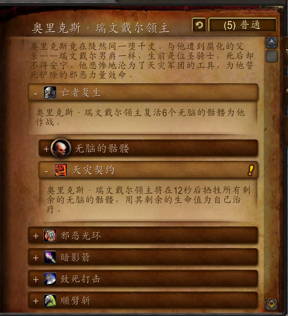 奥里克斯竟在陡然间一堕千丈。与他遭到腐化的父亲——瑞文戴尔男爵一样,生前是位圣骑士,死后却不得安宁。他悲惨地沦为了天灾军团的工具,为他誓死铲除的邪恶力量效命。