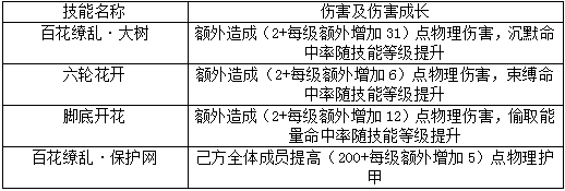 罗宾的三个主动技能除了输出之外都有额外的沉默、束缚和能量偷取的软控技能,尤其能量偷取能够延迟对方角色的技能释放,能够增加全员物理护甲的被动技能提高己方生存力。因此罗宾的技能加点以百花缭乱·大树和脚底开花为主,以百花缭乱·保护网和六轮花开为辅。