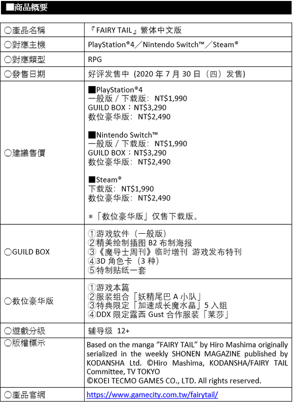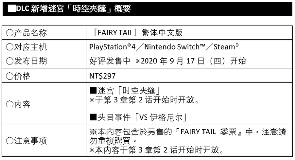 近日台湾光荣特库摩宣布,旗下RPG游戏《妖精的尾巴 魔导少年》于9月17日(四)起开始发布付费DLC新增迷宫「时空夹缝」,于PS4、Swtich以及PC上Steam平台同步更新,已拥有季票的玩家可以直接获取。