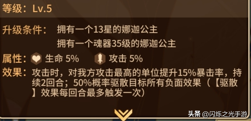 【评价】娜迦自身比较脆,中规中矩,只适用于爆发队伍。女娲、拉菲可以作为娜迦的上位替代。娜迦5级灵技+15%暴击,性能还算OK,值得一练。