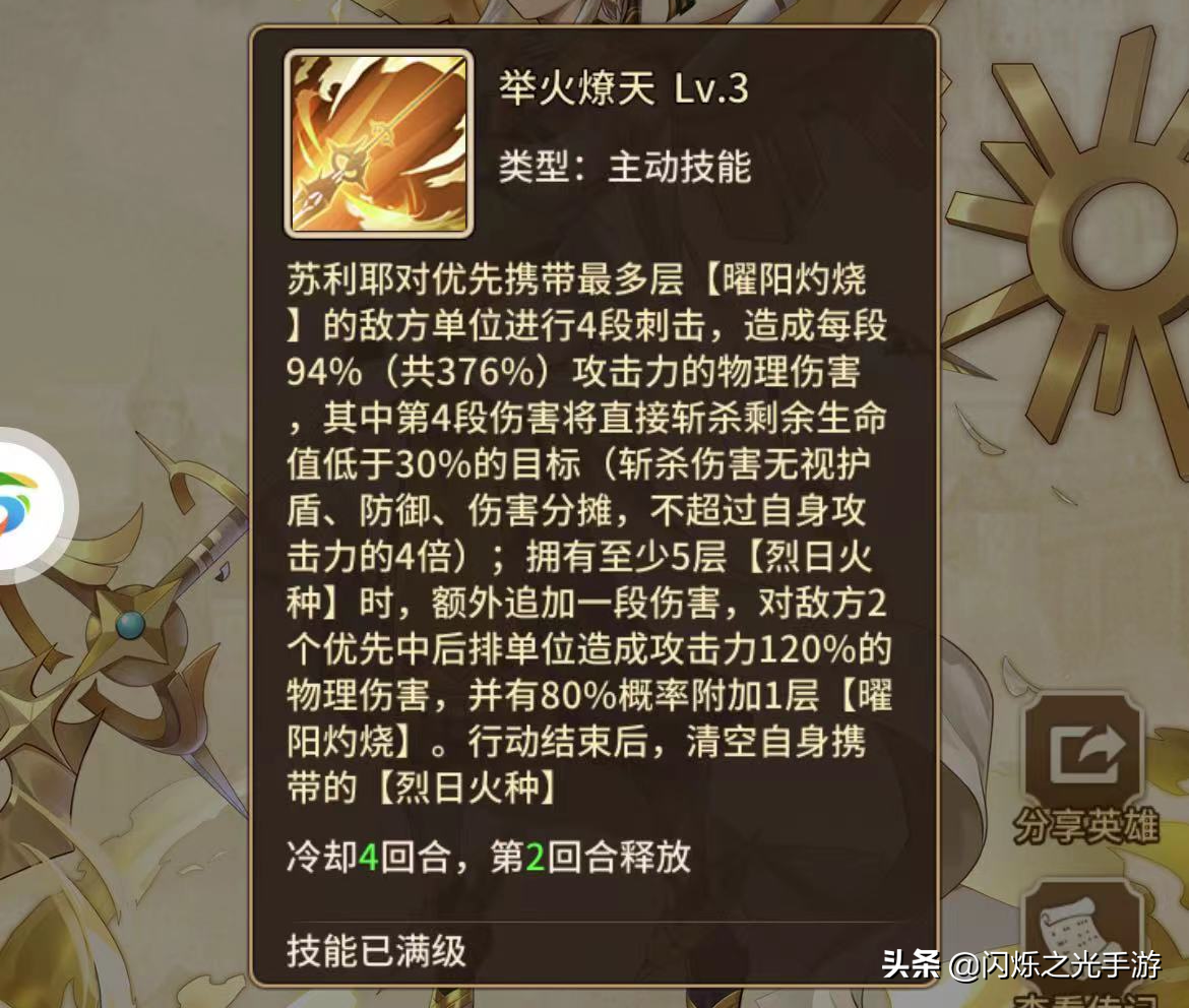 触发【魂枪】格挡或己方受【魂枪】保护的英雄主动出手,均可让苏利耶获得【烈日火种】buff,效果类似狼王的怒气。