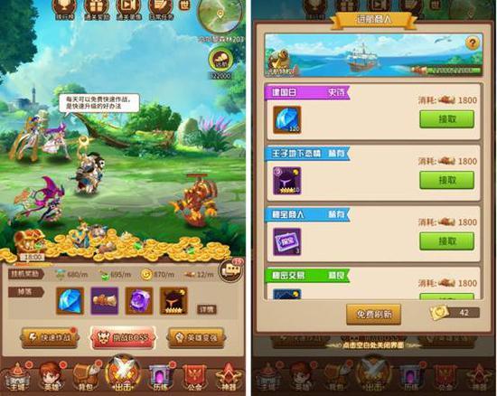 游戏不再局限于单纯挂机,远航功能让英雄放置得到最大化体现,只要是游戏里叫得出名字的资源,无需手动操作,通过一键派遣英雄完成远航任务都能得到。除此之外,高星碎片会在挂机的时候掉落,偶尔还会伴随远航任务出现,这么看来,集五星英雄应该不是顶困难的事情。