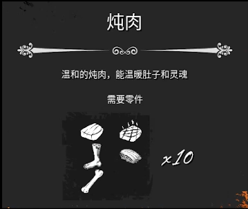 游戏中厨师可以手机10个肉块,制作炖肉,推荐玩厨师的玩家优先杀狼,获得肉块的同时,还可以手机背包需要的材料。