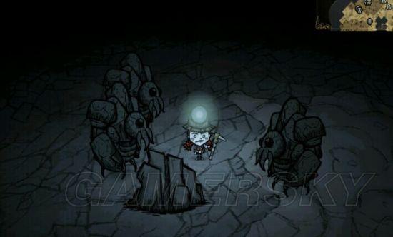 洞穴里除了存在普通的地面蜘蛛巢外,还存在洞穴特有的蜘蛛物种。在洞穴一层通往二层入口区域,必定存在大量的这种洞穴蜘蛛群体。带一些石虾或者兔人推过去,砸掉堵在二层洞口的铥矿石,就可以进去了。