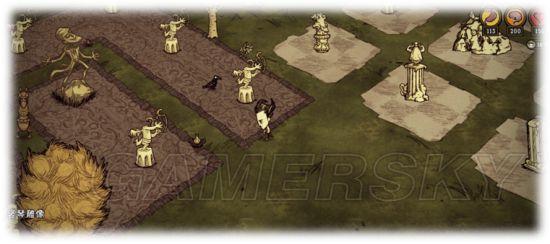 这个草原很小,只有几个兔子窝,穿过草原,遇到发条奇遇,只有一只发条骑士,右边是可疑的雕像区域,你用镐子敲开右边的一些雕塑会露出发条骑士和发条主教的躯干,在野外捡到的“可疑的大理石”,可以背过来修复。