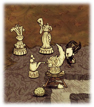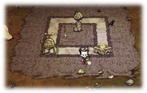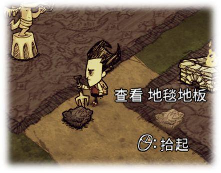 作为一个老司机,我做草叉的目的无外乎挖走野外的地毯、棋盘、卵石路草皮,用来美化我的营地,我砸烂了麦斯威尔的雕塑,获得了国王雕塑的素描。
