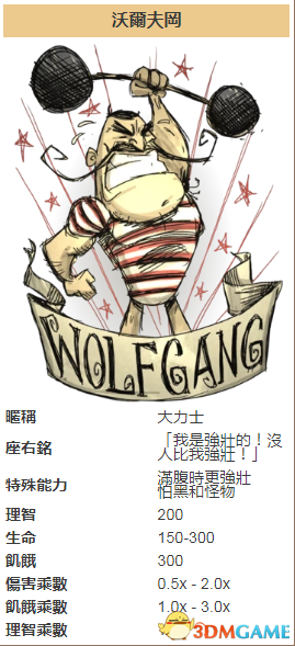 沃尔夫冈是第二个可以解锁的角色(320 经验即可),他能造成更高的伤害,并且生命值也远高于别的角色,但是这些都建立在维持着较高饥饿值得情况下。