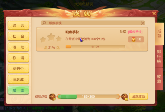 "眼疾手快"这一成就的完成条件是在帮派内累计抢到过100个红包,所以难度极高,首先得有心情好的"大佬"在帮派内打赏,而这种机会一般都是逢年过节或是"大佬"心情好的时候才会有,其次红包一旦发出也很容易在几秒之内被"洗劫一空"。所以若是能达成这个成就,那必须得有"单身30年"的手速吧。当然,也不排除一些大佬玩家为了完成这个成就,在群里自发自抢100个红包。