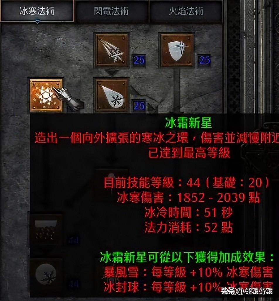 在打造以冰霜新星为主力输出的法师时,大家就会发现一个有趣的事情,作为协同技能存在的暴风雪和冰封球,伤害会比冰霜新星更高一些。但如果非要使用冰环技能,也只得如此,何况冰环毕竟可以无脑释放,其它两个技能就不行了。