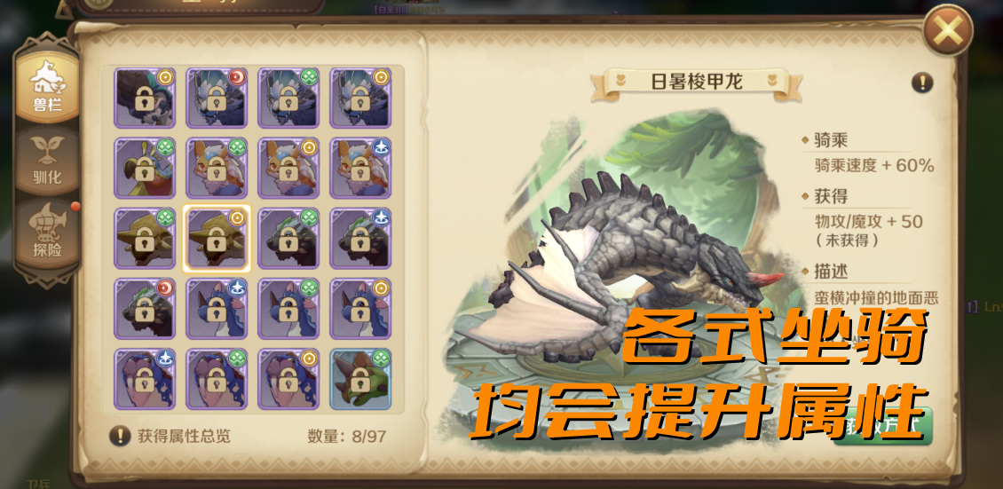 除了以上三项主要提升战力的方式外,基于游戏内非常丰富的坐骑种类,每解锁一款新坐骑均会为角色增加战力值。