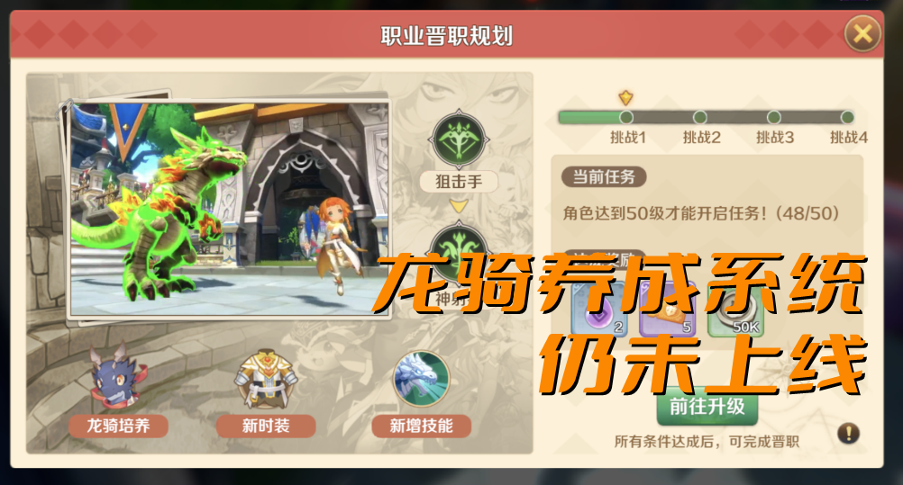 目前关于“龙”的元素,主要呈现在各式镶嵌龙晶、龙族怪物及坐骑,虽然战骑系统已经上线,但仅是通过“消耗品—契约石”进行召唤,而非培养的内容。而六十级即将开放的龙骑系统,通过引导内容可以看到基础信息,或为新的“龙元素”玩法。