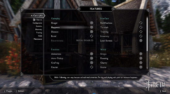 MOD制作者“DarkFox127”此前为我们带来了《上古卷轴5:天际》的「猫的生活(A Cat's Life)」MOD,在这个MOD中,你可以在游戏中收养、购买或者从别人那里偷猫,给它们一个家并喂养他们。此外,你还可以“简化”MOD的功能,Mod配置菜单可让玩家定制所需功能,移除收养和商店,只在游戏中观赏野猫和流浪猫。