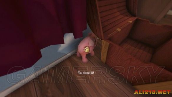 随后在箱子后面找到粉色的小象玩具。随后躲进衣橱中即可,这里比较黑,按X打开小熊眼睛来照亮通路,按下RS下蹲即可快速通过。出来后来到夜晚,需要先到达母亲的房间,然后顺着地上印记来的壁橱。