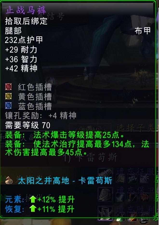 除了以上几个经典掉落之外,我们也要提醒一下大家,在太阳井中不少掉落是可以使用太阳之尘兑换成同甲其他类型的掉落的。比如说卡雷苟斯的止战马裤,就能兑换为激战马裤,从奶牧和奶德极品,变成暗牧极品。