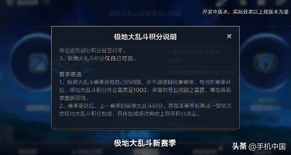 本次极地大乱斗新赛季将会有自己的周期,并不跟随排位赛赛季。每当新赛季开启,玩家还可以在进入极地大乱斗模式时,收到上赛季的赛季报告,显示上赛季分数、称号等信息。在赛季更迭后,极地大乱斗新赛季积分将重置至1000分。而上一赛季的极地大乱斗积分,将在本赛季折算成一定场次的极地大乱斗积分加成,具体加成场次将由上赛季积分决定。
