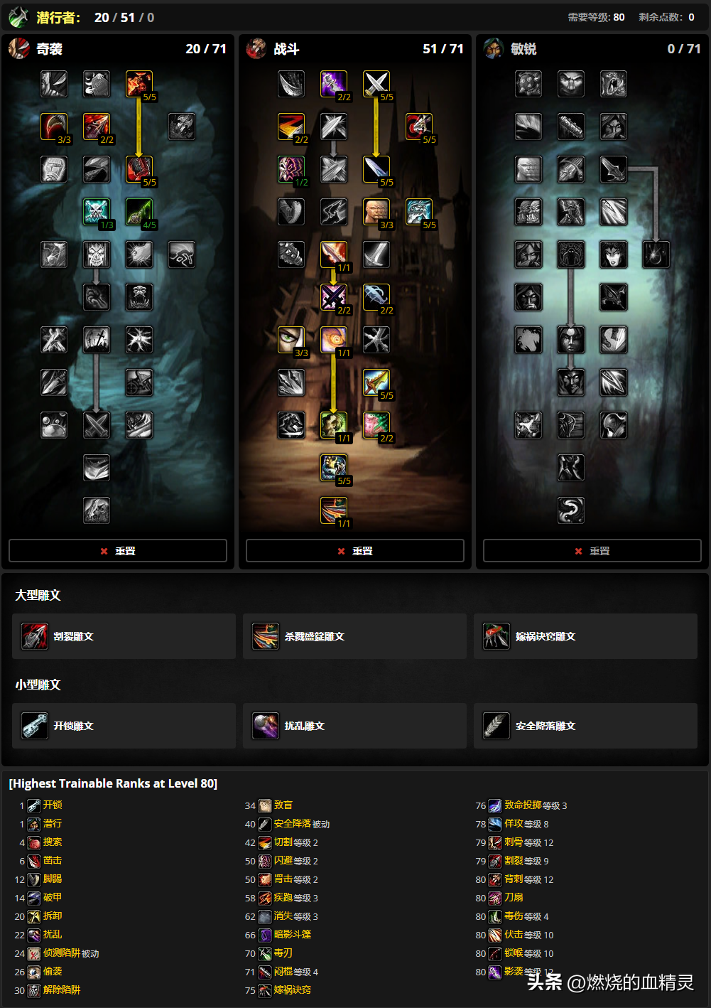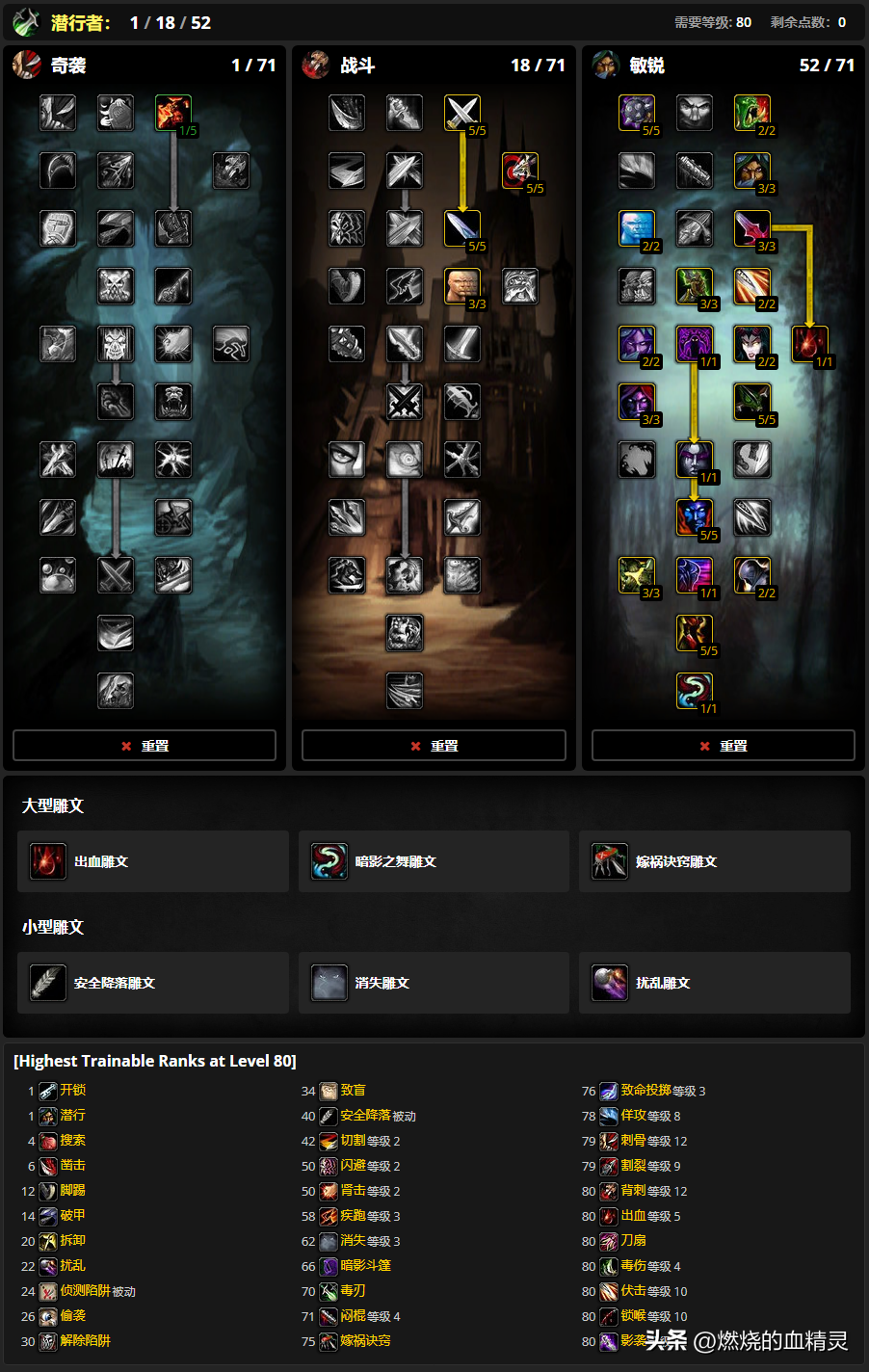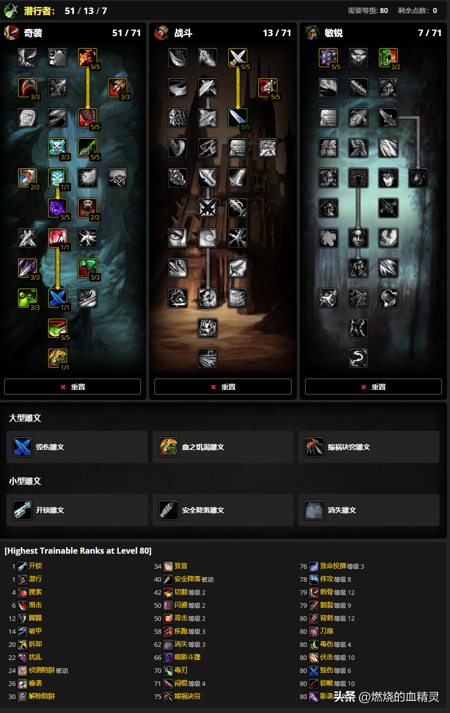 盗贼拥有三种输出天赋,团队副本pve主要是用奇袭和战斗天赋,敏锐天赋是传统pvp一直使用的天赋,奇袭和战斗这两个天赋在测试服里面输出表现基本差不多,如果是只打副本敏锐可以直接忽略,在wlk副本单体输出测试下来,盗贼绝大数时候是排名第一的输出,能和盗贼拼的职业只有邪dk了。盗贼各版本一直是可玩性最高的职业之一,wlk版本也不会例外.