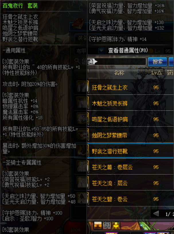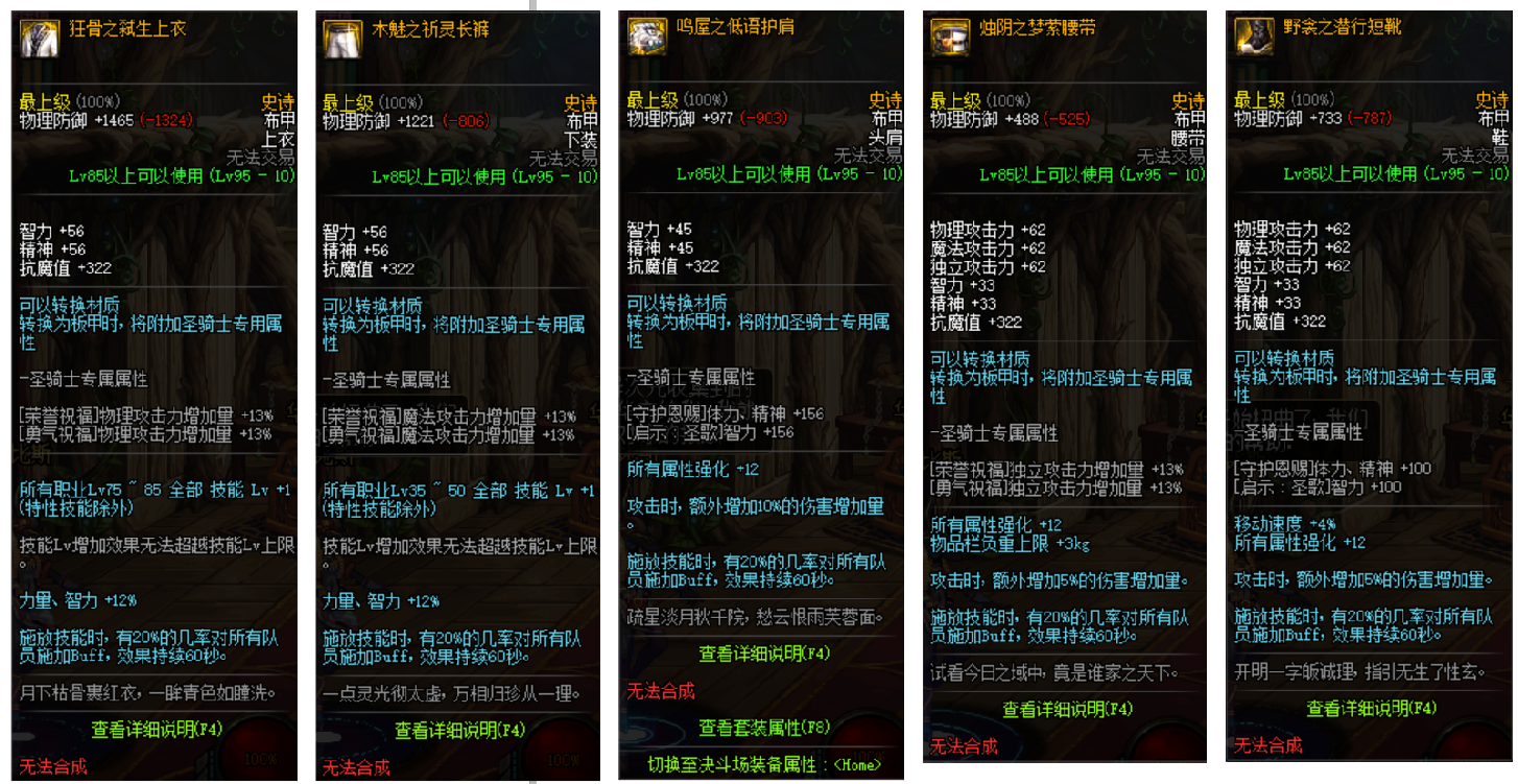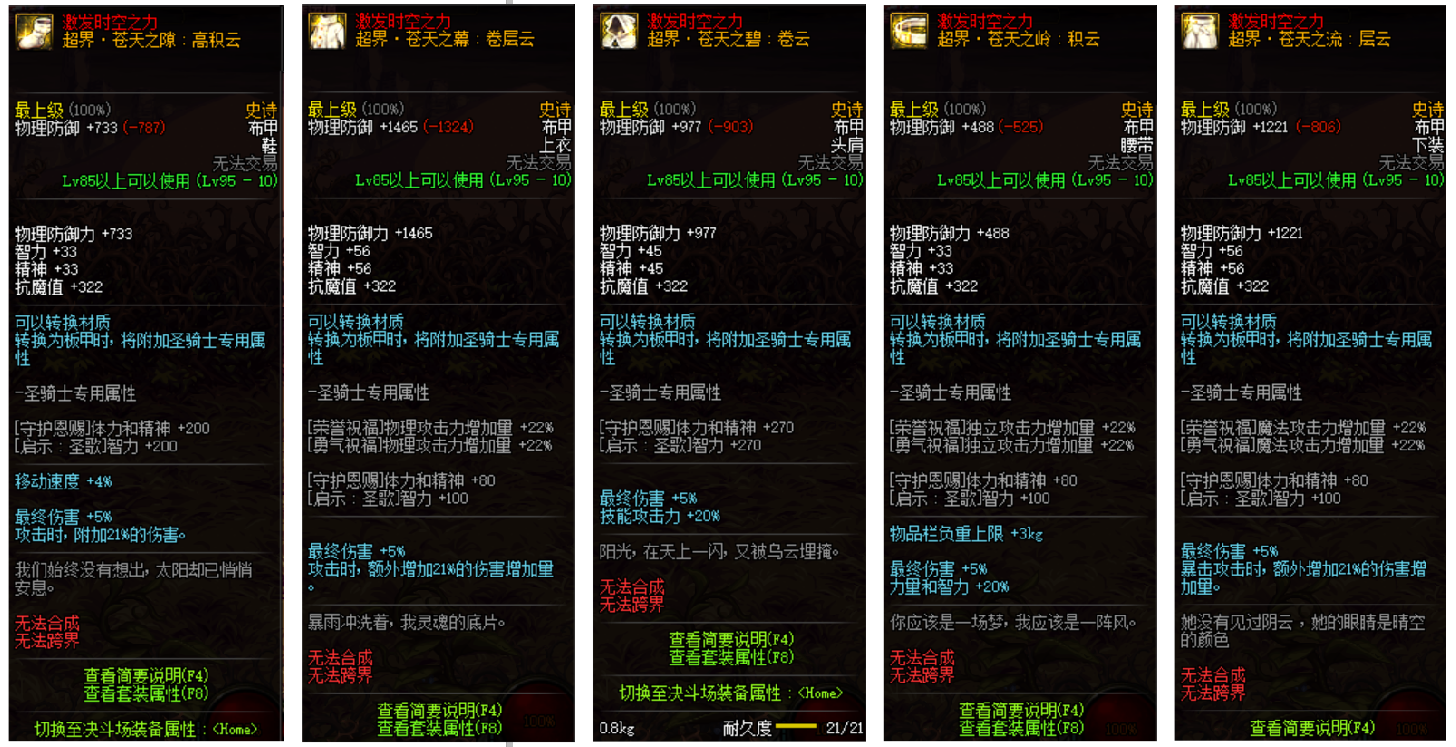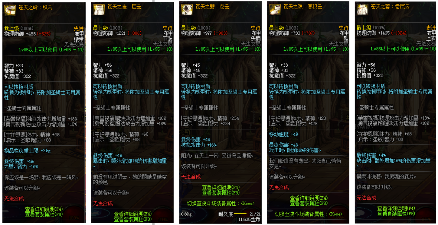 这一套就是95版本普雷出来前的毕业史诗套装,也称之为95B套,属性是苍穹之云的升级版本,增加了装备的属性加成,但是其他效果没有变化哦