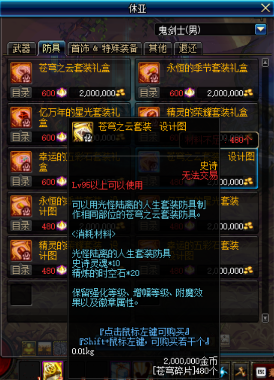 这一套就是95版本大家最主要的套装了,这一套史诗目前产出的方式有3中,第一种是非常贵的深渊天空深渊,入场需要30个时空石兑换的探测石和30张邀请函,这里会掉落成品的泰波尔斯史诗,也会产出材料天空之愿,10个天空之愿兑换1个苍穹碎片,600个材料可以直接兑换1件成品史诗;其次是刷泰波尔斯崩坏乐园,每周可以刷6次,每次获得30个苍穹碎片,也会产出成品史诗;最后是通过B套升级获得,480个材料加上200万金币升级。