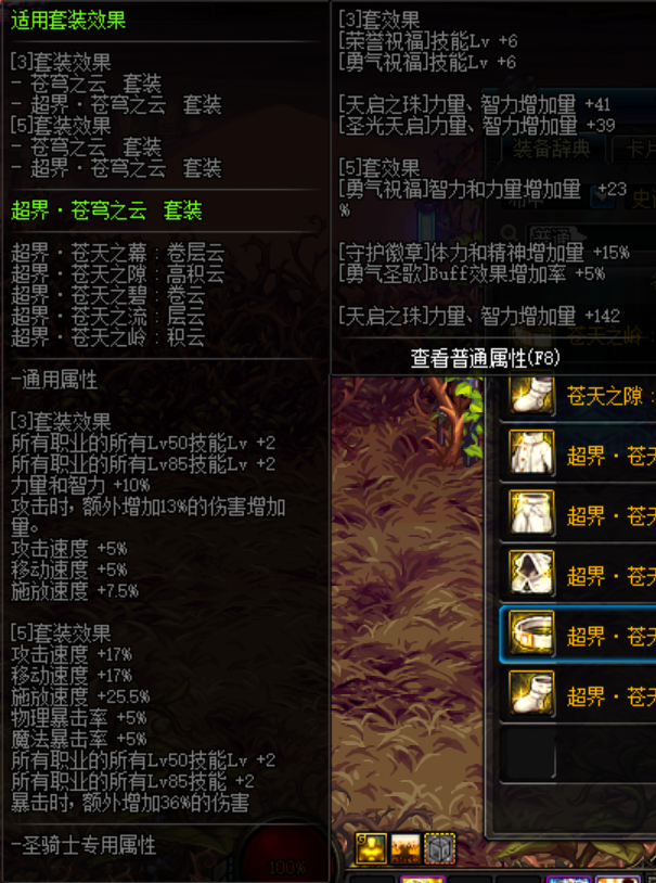 至于套装属性,看这个说明与韩服其实一样,如果大家升级了一件超时空,那么套装属性就会直接是一套超界属性的装备,整体增加了1级的技能等级,三速加成和追加黄字和爆伤,具体属性大家可以看图,我们就不再写出来了。