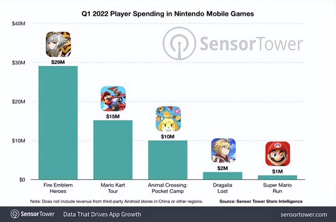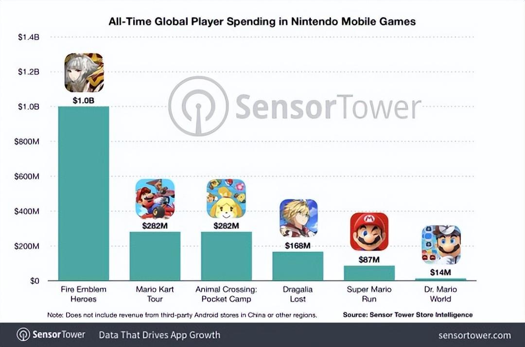 而任天堂最近停服的《失落的龙约》以1.68亿美元的收入排名第四。《超级马里奥跑酷》以8700万美元排名第五,《马里奥医生》以1400万美元排名第六。