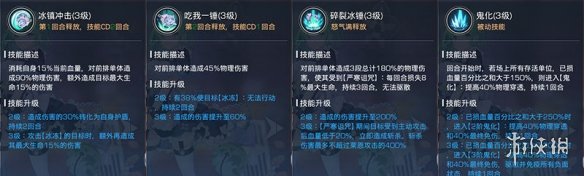 二技能对敌人单体造成伤害,同时有概率使敌人冰冻。因为是优先攻击前排单体敌人,如果敌方前排的主要作用是扛伤,冰冻的作用就不明显。主要针对的是高输出或者能吸血的前排敌人。