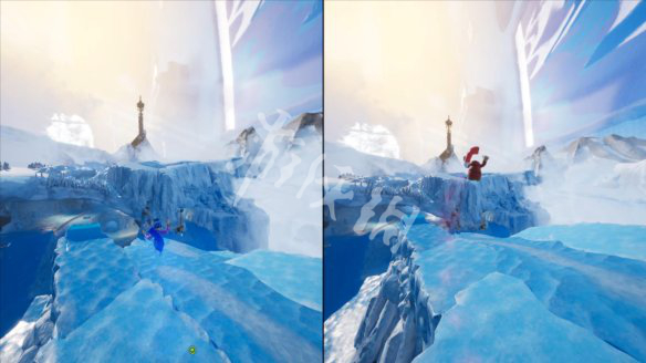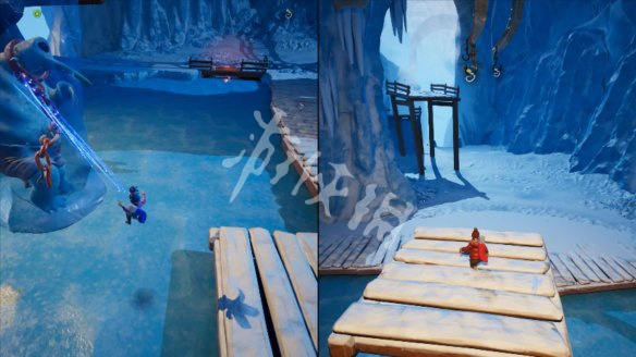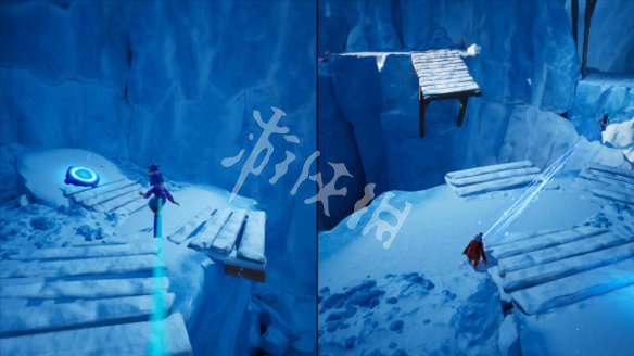 8.接下来雪崩不止的位置,需要拉着地标×移动到另一侧,到下图位置,一个人到对面,两人人同时吸引,到中间区域,完成本关。