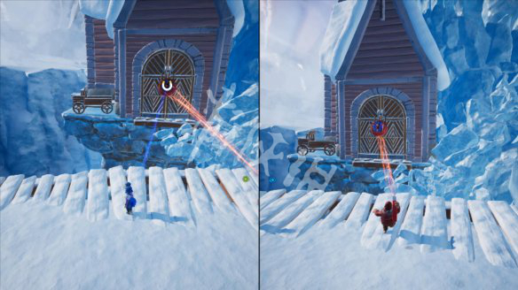 2.剧情结束后就是两人的滑雪之旅,非常爽,到达下图位置遇到一个难点,首先小梅把冰雕拉出来。拉到下图位置后,科迪利用红色磁铁反弹到冰雕上。