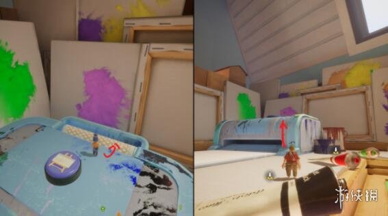 小节开始后穿过城堡门前往右手边。在尽头你会看到一些颜料和一台打印机,跳到打印机后背的旋转处被压扁即可。
