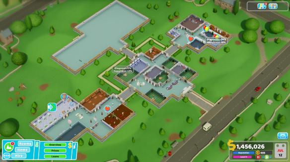 一个是厕所,由于AI寻路的一些问题,如果厕所离着太远,病人医生就宁可要憋死也不会去那里,所以厕所的面积一方面不要追求太小,免得病人医生排队上厕所,另一方面是一个病区至少得有一个厕所,如果病区太大甚至要放2个厕所。厕所和员工休息室是一个概念,如果太小太少,会导致大家排队带来的效率低下,另一方面跋山涉水去一趟休息,也非常浪费时间。