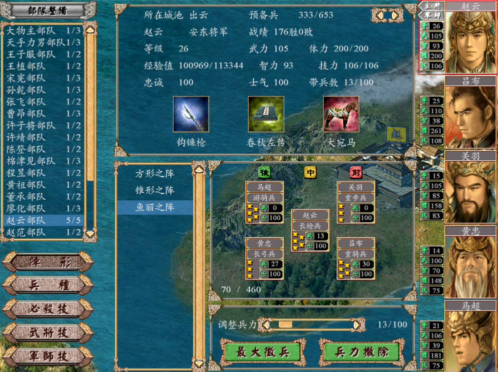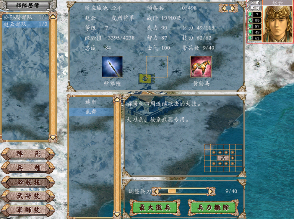 好了,最后总结一下,赵云快速成型并统一的要点,开始通过单挑学必杀,然后就是不停地进攻,和敌方把等级拉开,每次攻下一个城,城池都有预备兵,把兵力补上,体力回满,就接着进攻,不要停,保持等级优势。我灭掉所有诸侯时,等级比敌方高了15级!