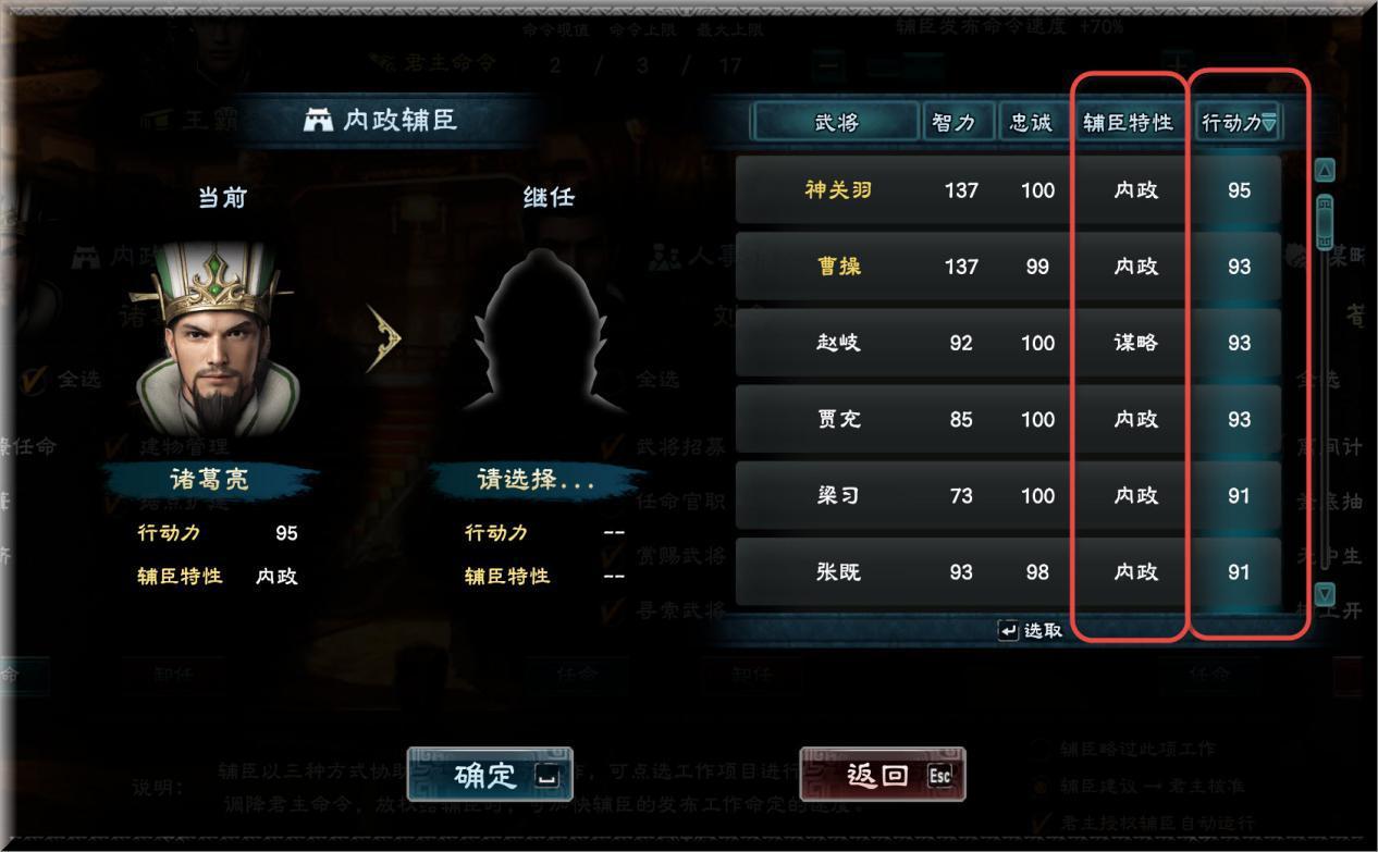 在选择内政辅助臣方面,可以按照执行力进行一个排序,优先使用执行力高的内政辅臣,还有就是内政辅臣的特性,这个很重要,内政、人事和谋略三个特性决定了自身的效率。比如说关羽可以直接用来当内政官,如果有诸葛亮也可以,看哪个属性高就用哪个,毕竟执行力一样。人事辅臣高执行力的比较稀缺,刘备是比较好的人选,其它如果看到88到90执行力的人事辅臣就可以凑合使用了。谋略辅臣比较多,荀彧和周瑜相对来说比较高,当然第一谋臣还是荀彧,非他莫属。