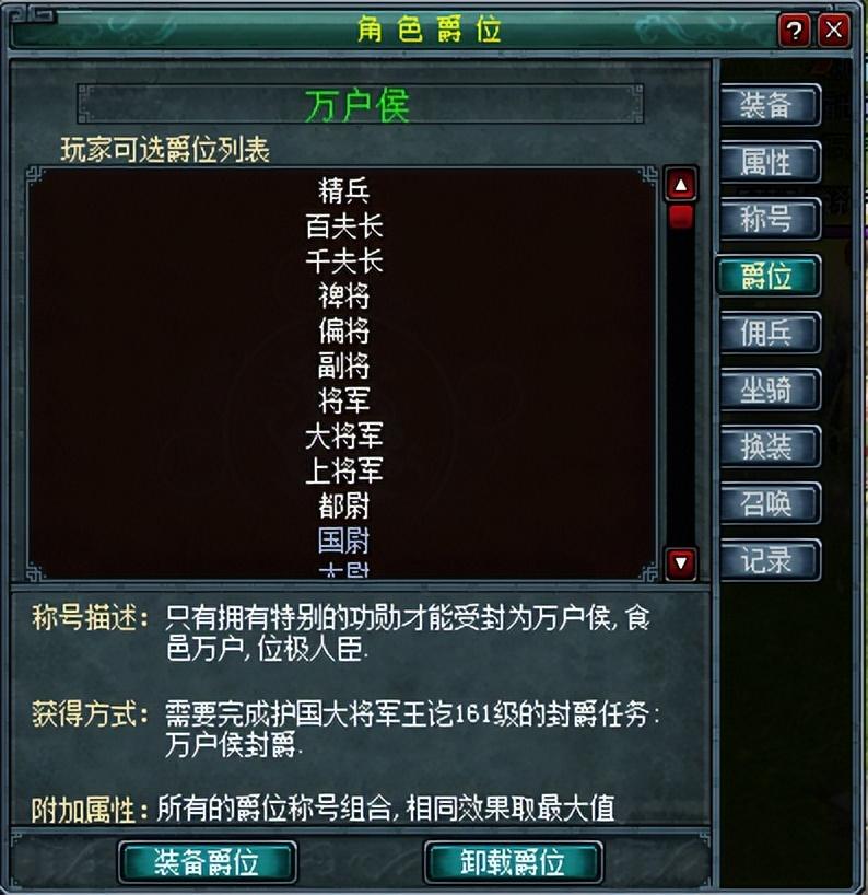 在《秦始皇》中,每当玩家提升10个角色等级,即可在任务界面领取到一个新的封爵任务,任务颁布的NPC为咸阳城的大将军王讫,通过封爵任务可以获得相应的爵位,同时不同的爵位也提供了不同的属性加成,在游戏中共包含了15个爵位,最后一个爵位将会在玩家等级达到161级时开放。
